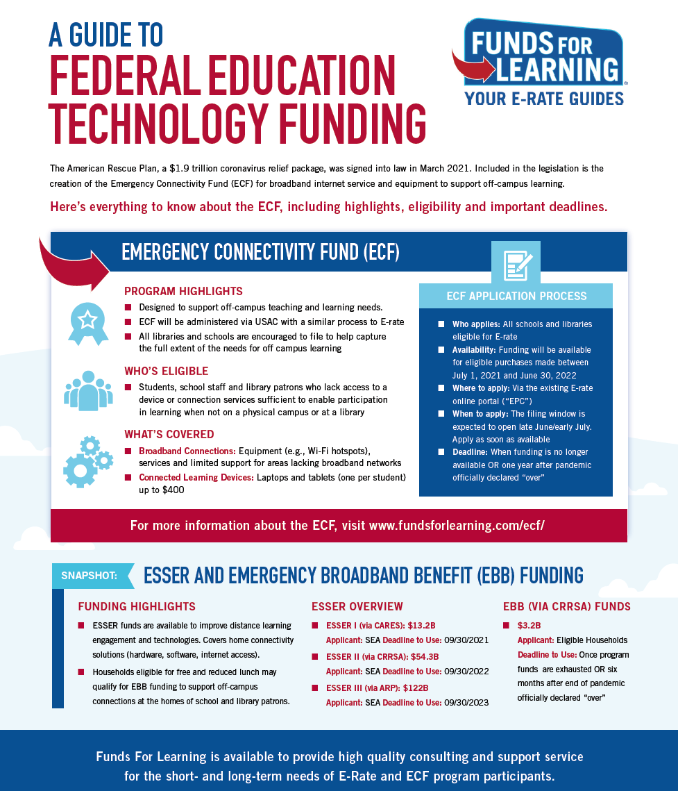 The rapid release of connectivity funding programs this last year has been confusing to many and may look like alphabet soup at times. Adding to the confusion is the programs all begin with the letter “e”. This infographic helps define the differences between three of the big programs: Emergency Connectivity Fund (ECF), Emergency Broadband Benefit (EBB) and Elementary and Secondary School Emergency Relief (ESSER). Understanding how and when to utilize these dollars is an essential step to closing the homework gap and connecting all students.
