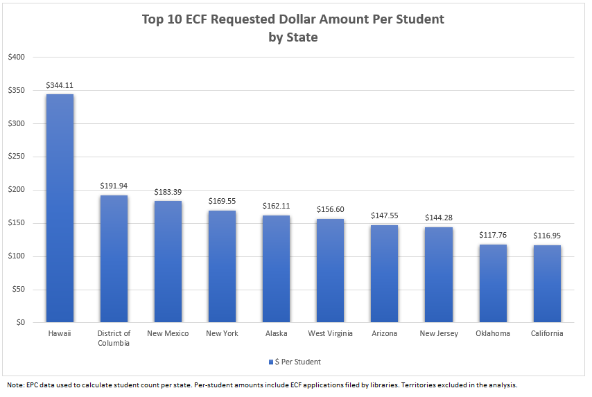 The first ECF filing window, which closed August 13, 2021, attracted applications from all 56 states and territories. Applicants requested a total of $5.137 billion to fund 9.1 million connected devices and 5.4 million broadband connections. Further analysis shows the state of Hawaii had the top requested ECF funds per student at $344.11 per student followed by District of Columbia with $191.94 per student.