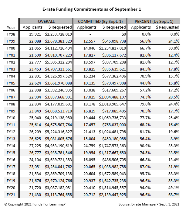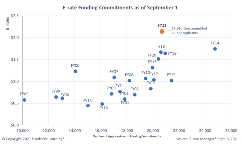 As of the first week of September, there have been $2.14 billion in E-rate discounts committed for funding year 2021. These have been committed to 20,712 applicants. 96.6% of all applicants have received a funding decision, and the funding decisions are the highest amount ever awarded by the first week of September.