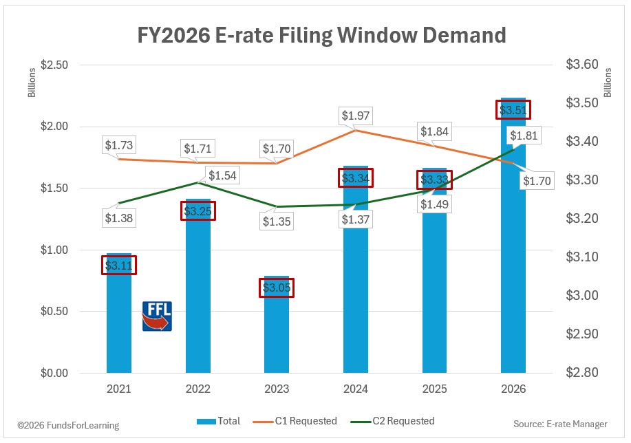 The FY2026 E-rate filing window closed last night, and the numbers are in: schools and libraries across the country requested a combined $3.51 billion in E-rate support — the highest total demand of the modern E-rate era.